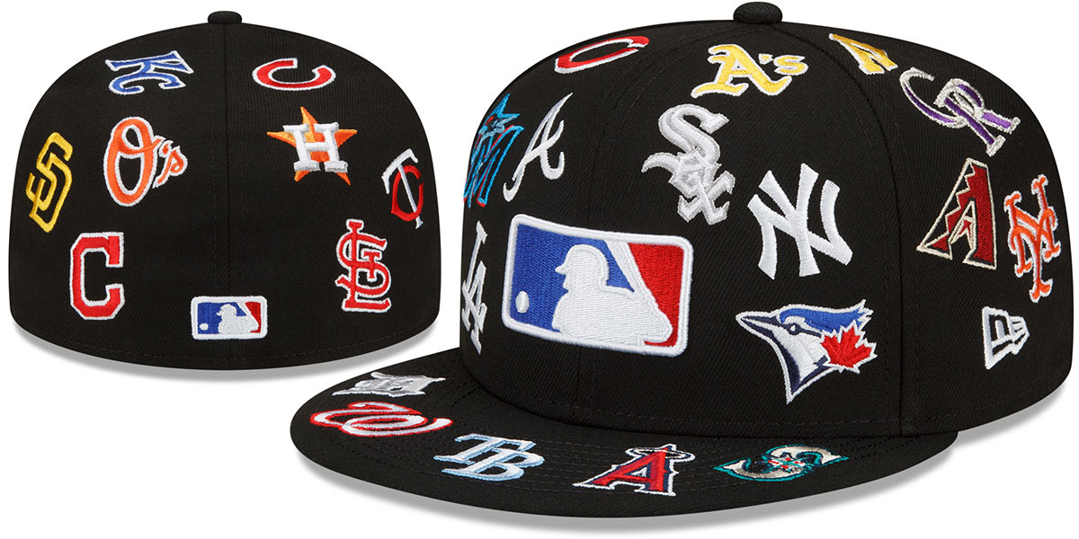 Authentic and ORIGINAL 59Fifty polyester fitted hat by New Era, black deep crown and visor and undervisor, MLB Batterman logo on front, MLB team logos embroidered ALL-OVER deep crown and visor in team colors, MLB Batterman logo on back. This hat is made by New Era and is licensed by the MLB - Major League Baseball.