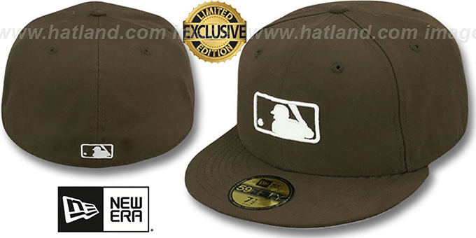 Authentic and ORIGINAL 59FIFTY fitted hat by New Era, brown authentic poly deep crown and visor and undervisor, raised MLB Batterman logo embroidery on front in white, matching flat embroidered MLB logo on back, New stock has a white New Era flag on side. This baseball cap is made by New Era and is licensed by the MLB - Major League Baseball.
