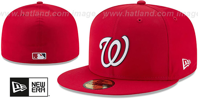 Authentic and ORIGINAL 59FIFTY fitted hat by New Era, Featherweight poly ProLight moisture wicking and UV protective performance red deep crown and visor, light grey undervisor, beveled rubber team logo on front, beveled New Era flag logo on side, matching beveled rubber MLB logo on back, This is the style of Onfield hat worn by all MLB teams for the 2018 season in Batting Practice before all games. This Washington Nationals baseball cap is made by New Era and is licensed by the MLB - Major League Baseball.