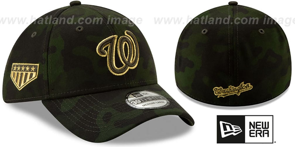 New Era 39THIRTY authentic poly stretch fit hat, dark green and black camo crown and visor and undervisor, matching raised embroidered 2019 Armed Forces Day team logo on front in metallic gold and green, matching embroidered Armed Forces logo on side, New Era logo on opposite side, matching secondary team logo embroidered on back, EACH CAMO HAT PATTERN WILL BE SLIGHTLY DIFFERENT SO NO TWO HATS WILL BE THE SAME, This Flex 39THIRTY hat fits approximate head sizes (Sm / Med 6 7/8 - 7 1/4) (Med / Lg 7 1/4 - 7 5/8) (Lg / XLg 7 5/8 - 8 ), These commemorative caps honor our Armed Forces through patriotic themes that remind us all of the dedication of our troops. A portion of proceeds from the sale of 'Stars & Stripes' caps support the Welcome Back Veterans Fund, an organization that provides support to veterans and their families when they come home from war.. This Washington Nationals hat is made by New Era and is licensed by the MLB - Major League Baseball.