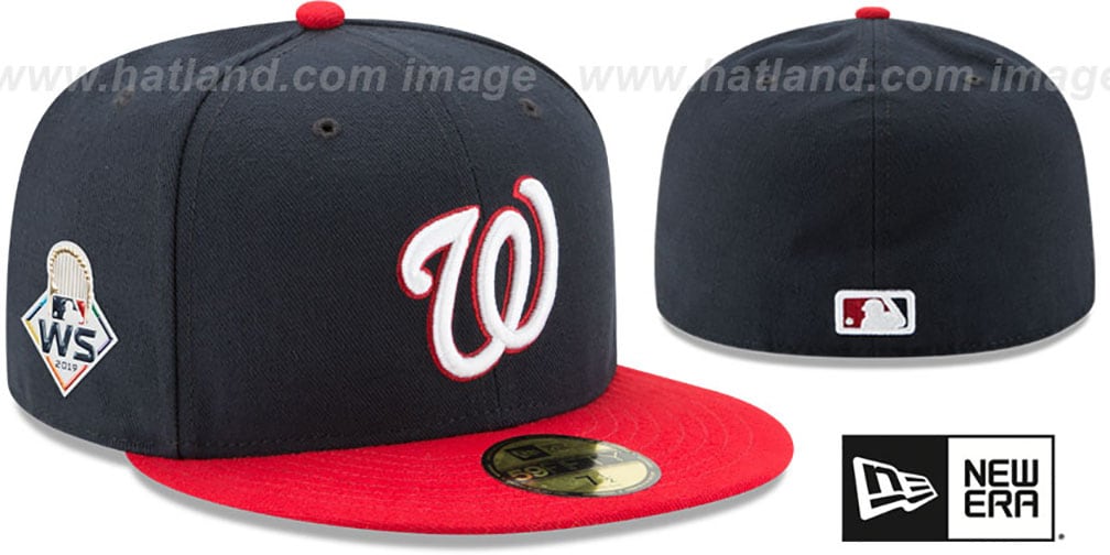 IN STOCK!!! NOW SHIPPING!!!, 2019 Onfield World Series hat worn during the World Series games, Authentic and ORIGINAL 59FIFTY fitted performance poly hat by New Era, navy blue deep crown and red visor, black undervisor, raised embroidered team logo on front, embroidered 2019 WORLD SERIES patch on side, MLB logo on back. This Washington Nationals baseball cap is made by New Era and is licensed by the MLB - Major League Baseball.