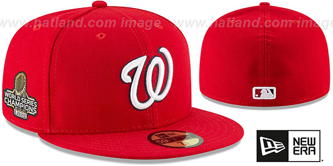 IN STOCK!!! NOW SHIPPING!!!, 2019 Onfield World Series hat worn during the World Series games, Authentic and ORIGINAL 59FIFTY fitted performance poly hat by New Era, red deep crown and red visor, black undervisor, raised embroidered team logo on front, embroidered 2019 WORLD SERIES CHAMPIONS patch on side, MLB logo on back. This Washington Nationals baseball cap is made by New Era and is licensed by the MLB - Major League Baseball.