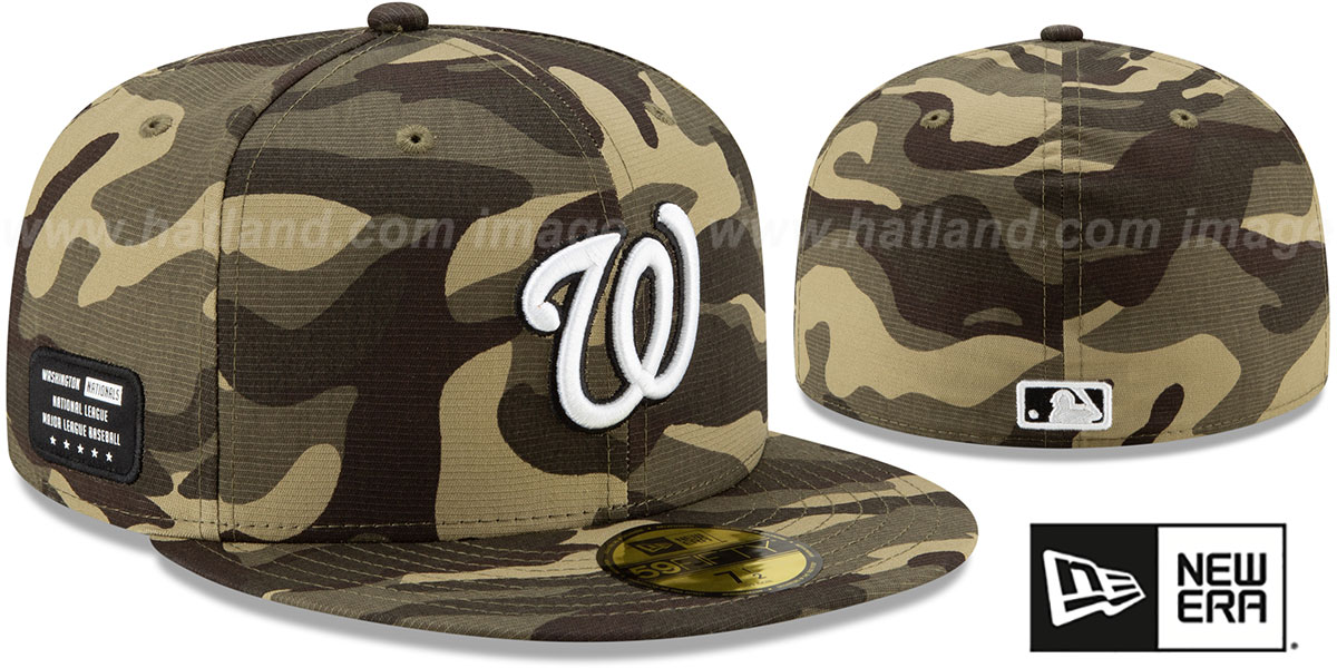 Authentic and ORIGINAL 59FIFTY fitted performance cotton rip-stop hat by New Era, Desert Storm camo crown and visor with black undervisor, raised embroidered 2021 Armed Forces Day team logo on front in white and black, embroidered black patch on side with team name and league print in white, New Era logo on opposite side, matching MLB logo on back, This is the Onfield hat worn by all MLB teams in games played during the 2021 Armed Forces weekend. These commemorative caps honor our Armed Forces through patriotic themes that remind us all of the dedication of our troops. A portion of proceeds from the sale of 'Stars & Stripes' caps support the Welcome Back Veterans Fund, an organization that provides support to veterans and their families when they come home from war. EACH CAMO HAT PATTERN WILL BE SLIGHTLY DIFFERENT SO NO TWO HATS WILL BE THE SAME. This Washington Nationals baseball cap is made by New Era and is licensed by the MLB - Major League Baseball.