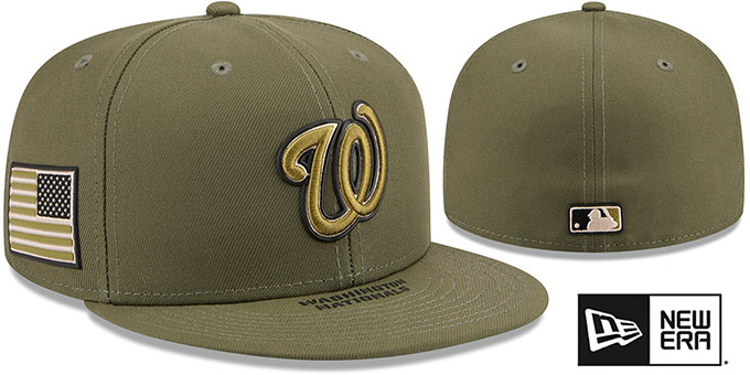 Authentic and ORIGINAL 59FIFTY fitted performance poly hat by New Era, moss olive green crown and visor with team name on top of visor, black undervisor with 5 rubber stars, woodland (army) camo on inside front panels, matching raised embroidered team logo on front with rubberized outline, rubberized Armed Forces USA Flag side patch, New Era logo on opposite side in black, matching MLB logo on back, This is the Onfield hat worn by all MLB teams in games played during the 2026 Armed Forces weekend. These commemorative caps honor our Armed Forces through patriotic themes that remind us all of the dedication of our troops. A portion of proceeds from the sale of 'Stars & Stripes' caps support the Welcome Back Veterans Fund, an organization that provides support to veterans and their families when they come home from overseas. This Washington Nationals baseball cap is made by New Era and is licensed by the MLB - Major League Baseball.