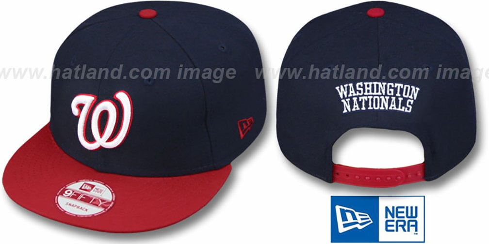 Original fit 9FIFTY adjustable wool hat by New Era that has similar deep crown and flat brim fit as the 59-Fifty, navy blue crown and red visor with grey undervisor, raised embroidered team logo on front, embroidered team name on back above secondary team color plastic adjustable Snapback strap This is an Onfield Replica of the style of hat worn by all MLB teams in a Snapback. This Washington Nationals hat is made by New Era and is licensed by the MLB - Major League Baseball.