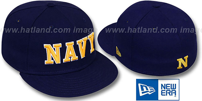 Authentic and ORIGINAL 59FIFTY fitted hat by New Era, navy blue wool blend deep crown and visor, raised embroidered NAVY logo on front, raised embroidered 'N' team logo on back. This Navy Midshipmen baseball cap is made by New Era and is licensed by the NCAA College.