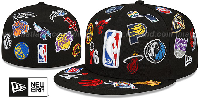 Authentic and ORIGINAL 59Fifty polyester fitted hat by New Era, black deep crown and visor and light grey undervisor, NBA Logoman logo on front, NBA team logos embroidered ALL-OVER deep crown and visor in team colors, NBA Logoman logo on back. This hat is made by New Era and is licensed by the NBA - National Basketball Association.