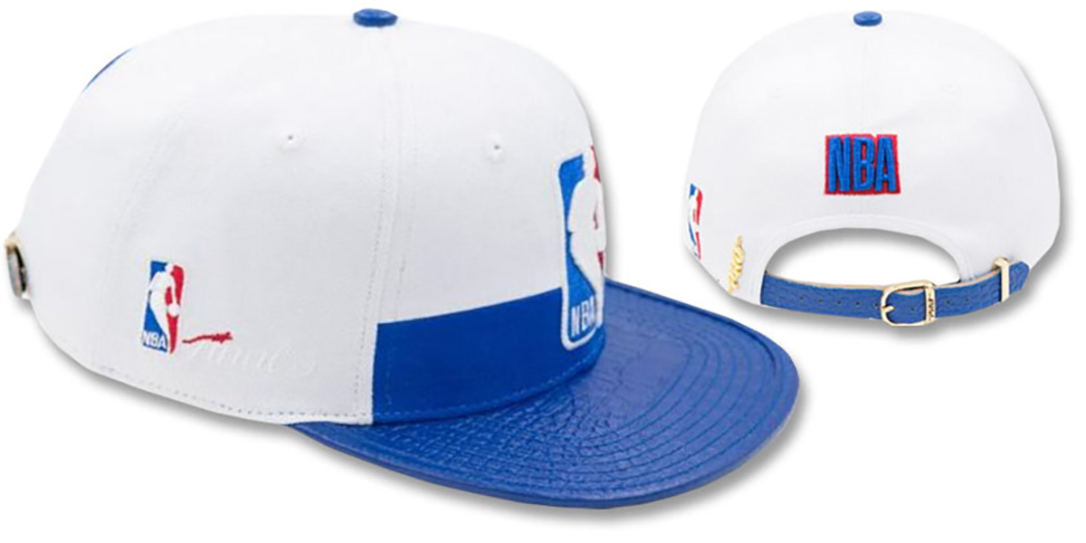 Authentic wool blend adjustable hat by Pro Standard with original cut and flat brim, white crown with royal blue pebbled 100% premium leather visor and royal undervisor, white crown with royal horizontal stripe on front, raised embroidered NBA logo on front, embroidered Finals logo on side, raised embroidered NBA on back and NBA logo on side back, matching premium leather strap and metal buckle closure with Pro Standard EXCLUSIVE stretch band attached to leather strap. This hat is made by Pro Standard and is licensed by the NBA - National Basketball Association.