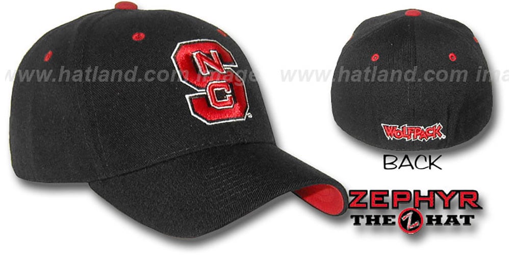 low profile structured 6 panel hat, black wool crown and visor, embroidered primary team logo on front in team colors, embroidered secondary logo on back. This North Carolina State Wolfpack hat is made by Zephyr and is licensed by the NCAA College.