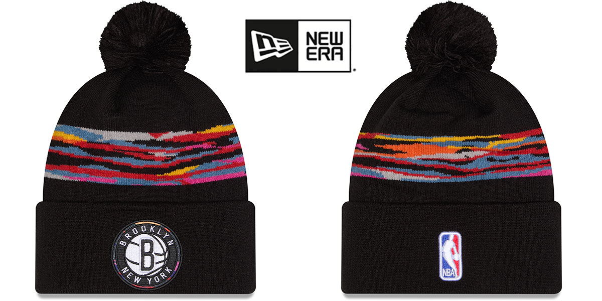 100% acrylic knit beanie crown with horizontal stripes, raised embroidered City Edition logo on front of black ribbed cuff, embroidered New Era logo on side, raised embroidered NBA logo on back, black pom-pom on top, Produced to match NBA City Edition Jerseys and hats worn throughout select 2025-2026 games. This Brooklyn Nets hat is made by New Era and is licensed by the NBA - National Basketball Association.