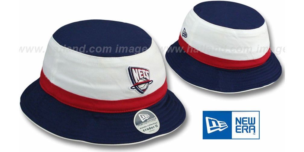 Fitted cotton Bucket hat by New Era, navy top-white and red stripe in center-navy brim with white piping trim, Raised team logo embroidery on front and New Era flag logo on side. This New Jersey Nets hat is made by New Era and is licensed by the NBA - National Basketball Association.