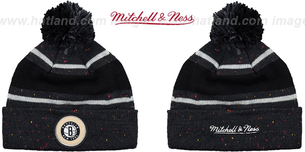Acrylic Knit Beanie by Mitchell & Ness, black speckled knit crown with charcoal gery and light grey stripes, embroidered team logo circle patch on black cuff, Mitchell & Ness embroidered on back, team color split pom-pom on top. This item is on SALE!. This Brooklyn Nets merchandise is made by Mitchell & Ness and is licensed by the NBA - National Basketball Association.