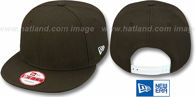 Authentic poly adjustable hat by New Era with original 9FIFTY cut and flat brim, brown crown and visor, light grey undervisor, no logos on either front or back of hat, white New Era flag logo embroidered on side of hat, white plastic snapback strap on back. This hat is made by New Era.