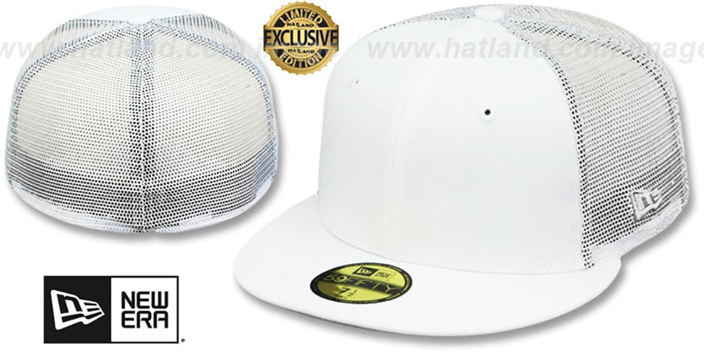 Non-Licensed and BLANK authentic fitted hat by New Era with 59Fifty Original fit, white authentic poly front panels and visor, white trucker poly mesh middle and back panels, light grey undervisor, no logos on front or back of hat, grey and white New Era flag logo embroidered on side of hat. This hat is made by New Era.