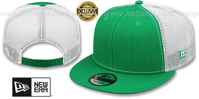 Authentic adjustable hat by New Era with original cut and flat brim, kelly green front panels and visor, white trucker poly mesh middle and back panels, light grey undervisor, no logos on front or back of hat, matching New Era flag logo embroidered on side of hat, kelly green plastic snapback strap on back. This hat is made by New Era.