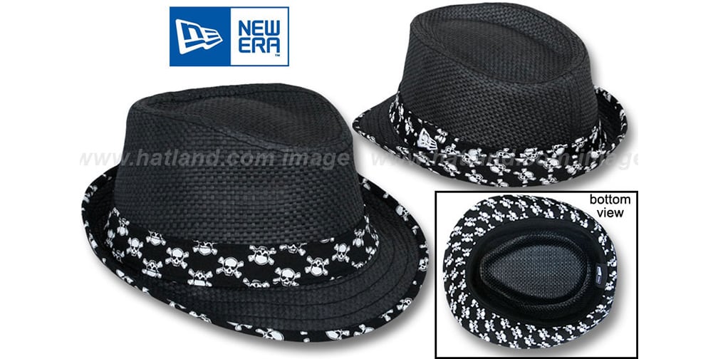 New Era Fedora with black paper straw crown and brim, black cotton twill band with white print Skulls, matching Skull print underbrim and flip Small/Medium 7 - 7 1/4 Large/XLarge 7 3/8-7 5/8 . This New Era Brand hat is made by New Era and is licensed by the New Era Brand.