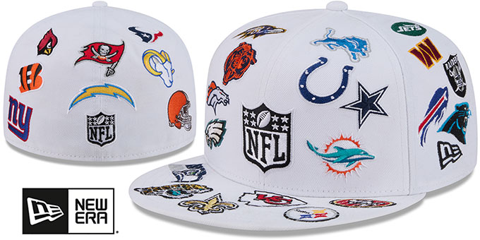 Authentic and ORIGINAL 59Fifty polyester fitted hat by New Era, white deep crown and visor and light grey undervisor, NFL Shield logo on front, NFL team logos embroidered ALL-OVER deep crown and visor in team colors, NFL Shield logo on back. This hat is made by New Era and is licensed by the NFL - National Football League.