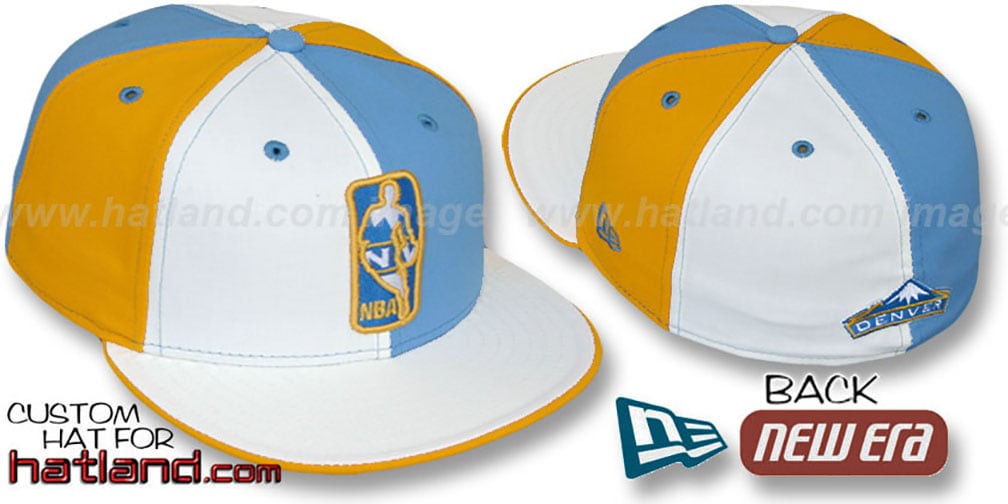 'Authentic' New Era ORIGINAL 5950 fitted hat, white-light blue-gold alternating pinwheel panels on crown, white visor with gold undervisor and flip, raised embroidered 'Key Insider' logo on front, embroidered team logo on back. This Denver Nuggets hat is made by New Era and is licensed by the NBA - National Basketball Association.