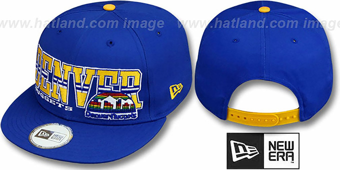 Original fit adjustable cotton twill hat by New Era that has similar deep crown and flat brim fit as the 59-Fifty, royal blue crown and visor with black undervisor, flat embroidered Bold city name over team logo and team name on front in team colors, New Era logo on side, secondary team color plastic adjustable Snapback strap . This item is on SALE!. This Denver Nuggets hat is made by New Era and is licensed by the NBA - National Basketball Association.