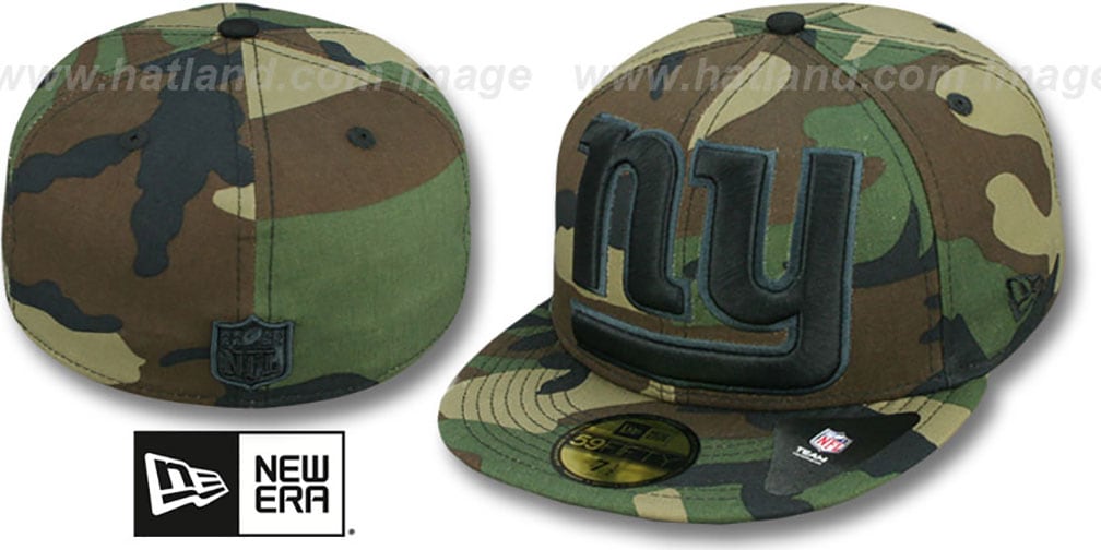 Authentic and Original 59FIFTY fitted hat by New Era, woodland camouflage (black, khaki, brown, green) cotton deep crown and visor, light grey undervisor, raised embroidered oversized MIGHTY XL team logo on front in black and dark graphite grey, New Era logo on side, matching embroidered NFL shield logo on back (each camo print will be slightly different and unique). This New York Giants baseball cap is made by New Era and is licensed by the NFL National Football League.