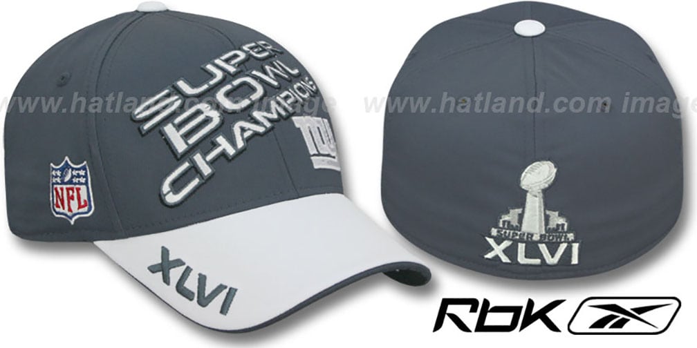 LIMITED QUANTITIES!Official Locker Room Hat worn after winning SUPERBOWL XLV... IN STOCK!!! NOW SHIPPING!!! Super Bowl 'CHAMPIONS' hat worn on the Sidelines and in Locker Room after winning the 2011 - 2012 Super Bowl XLVI title, slate grey with white brim poly stretch fit hat, embroidered 'SUPER BOWL CHAMPIONS' on front with team logo below, stretch fit back with Super Bowl XLVI logo embroidery on back One Size Fits Most Flex Hat. This New York Giants hat is made by Reebok and is licensed by the NFL - National Football League.