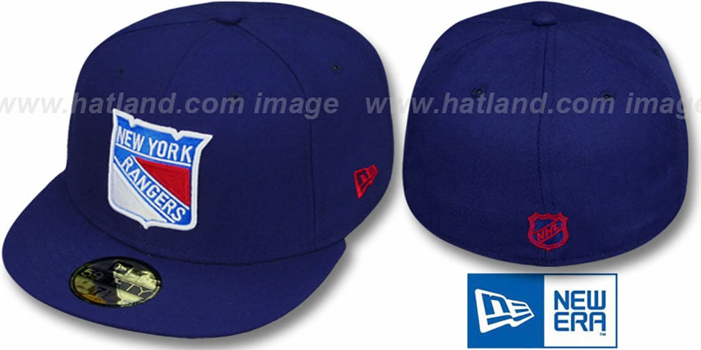 Authentic and ORIGINAL 59Fifty wool fitted hat by New Era, team color royal blue deep crown and visor and undervisor, raised embroidered primary team logo on front, embroidered NHL logo on back. This New York Rangers hat is made by New Era and is licensed by the NHL National Hockey League.