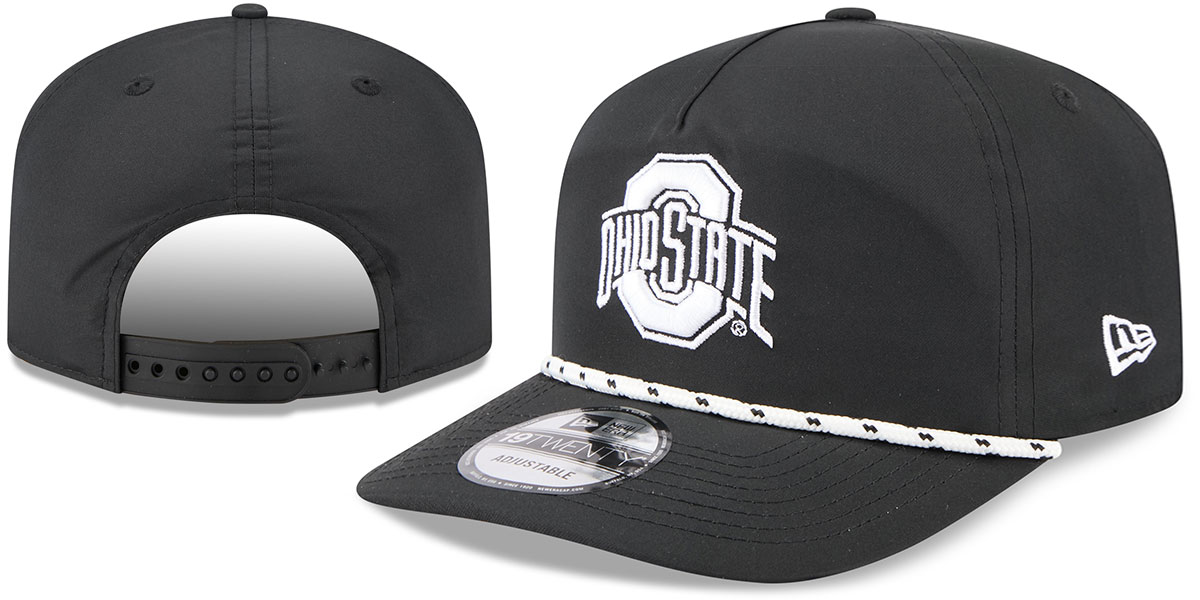 This 19TWENTY adjustable hat by New Era has a relaxed fit crown with pinched front panel construction and a mesh tray insert for light support. It has a poly nylon black crown and squared edge pre-curved visor with a black and white rope along brim. The undervisor is light grey, and the front sports a raised embroidered team logo in black and white. The side displays a matching embroidered New Era flag, and the back has an adjustable black rubber Snapback closure.. This Ohio State Buckeyes hat is made by New Era and is licensed by the NCAA - National Collegiate Athletics Association.