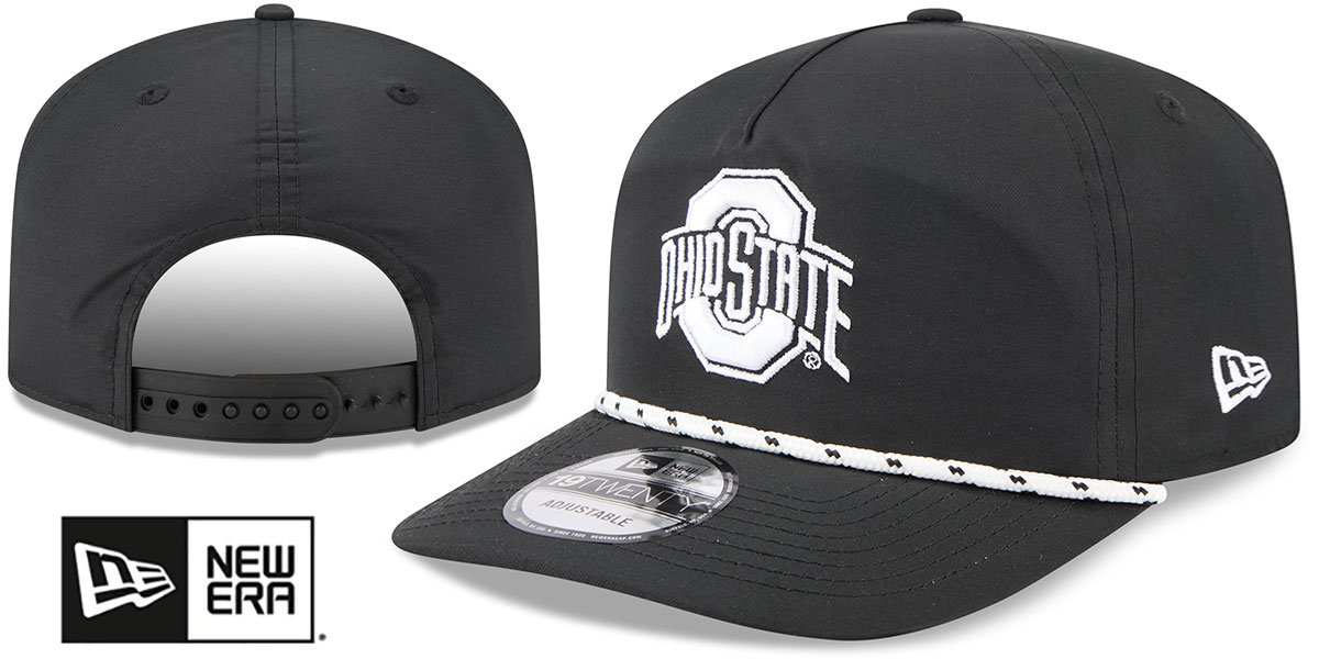 This 19TWENTY adjustable hat by New Era has a relaxed fit crown with pinched front panel construction and a mesh tray insert for light support. It has a poly nylon black crown and squared edge pre-curved visor with a black and white rope along brim. The undervisor is light grey, and the front sports a raised embroidered team logo in black and white with a red eye. The side displays a matching embroidered New Era flag, and the back has an adjustable black rubber Snapback closure.. This Ohio State Buckeyes hat is made by New Era and is licensed by the NCAA - National Collegiate Athletics Association.