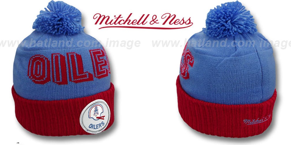 Throwback Knit Beanie by Mitchell & Ness, embroidered circle Throwback team logo patch on front, sky (light) blue ribbed knit crown with team name, red ribbed cuff, matching team color pom-pom on top. This Houston Oilers hat is made by Mitchell & Ness and is licensed by the NFL - National Football League.