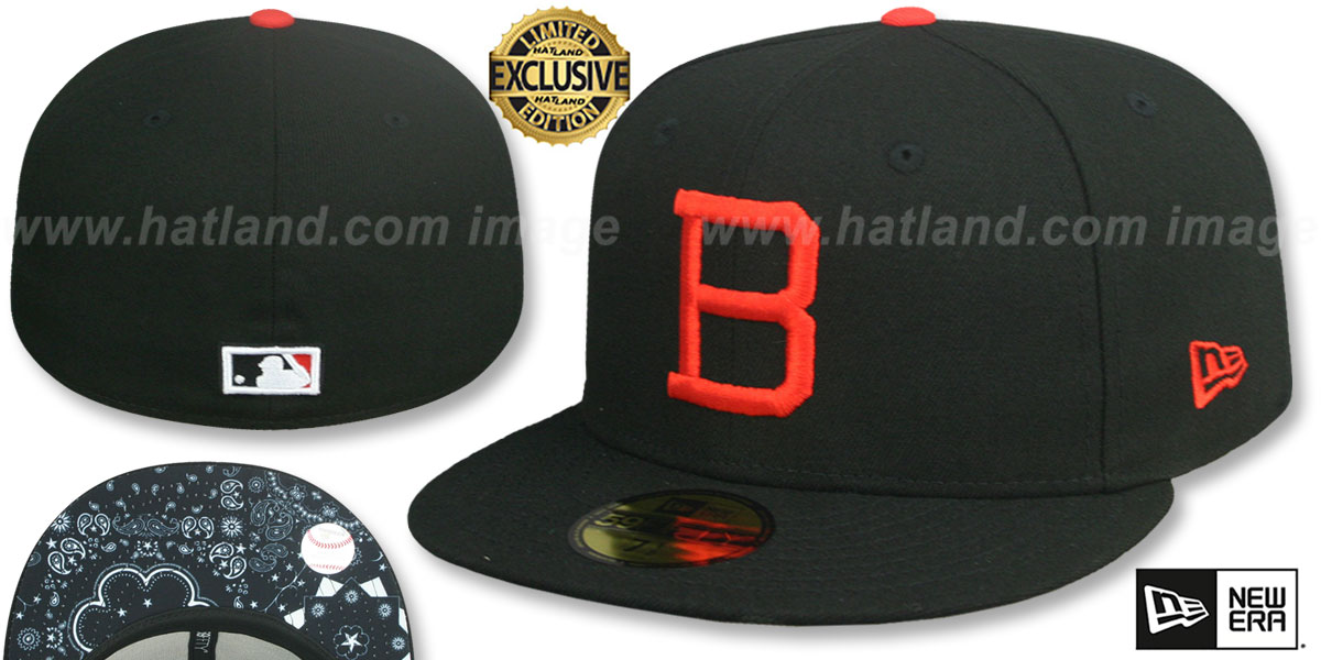 Authentic and ORIGINAL 59FIFTY fitted hat by New Era, black authentic poly crown and visor, black bandana undervisor-bottom, raised embroidered Cooperstown team logo on front, matching embroidered New Era logo on side, matching raised embroidered Cooperstown MLB logo on back, Each black bandana print will be different so that no 2 hats will have the same undervisor-bottom. This Baltimore Orioles baseball cap is made by New Era and is licensed by the MLB - Major League Baseball.