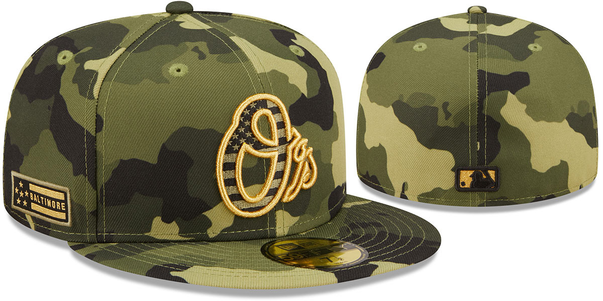 Authentic and ORIGINAL 59FIFTY fitted performance poly hat by New Era, green camo crown and visor with black undervisor, raised embroidered 2022 Armed Forces Day team logo on front in metallic gold with black and olive USA flag fill, embroidered 6 star patch on side with city in metallic gold and black, New Era logo on opposite side in metallic gold, matching MLB logo on back, This is the Onfield hat worn by all MLB teams in games played during the 2022 Armed Forces weekend. These commemorative caps honor our Armed Forces through patriotic themes that remind us all of the dedication of our troops. A portion of proceeds from the sale of 'Stars & Stripes' caps support the Welcome Back Veterans Fund, an organization that provides support to veterans and their families when they come home from war. EACH CAMO HAT PATTERN WILL BE SLIGHTLY DIFFERENT SO NO TWO HATS WILL BE THE SAME. This Baltimore Orioles baseball cap is made by New Era and is licensed by the MLB - Major League Baseball.