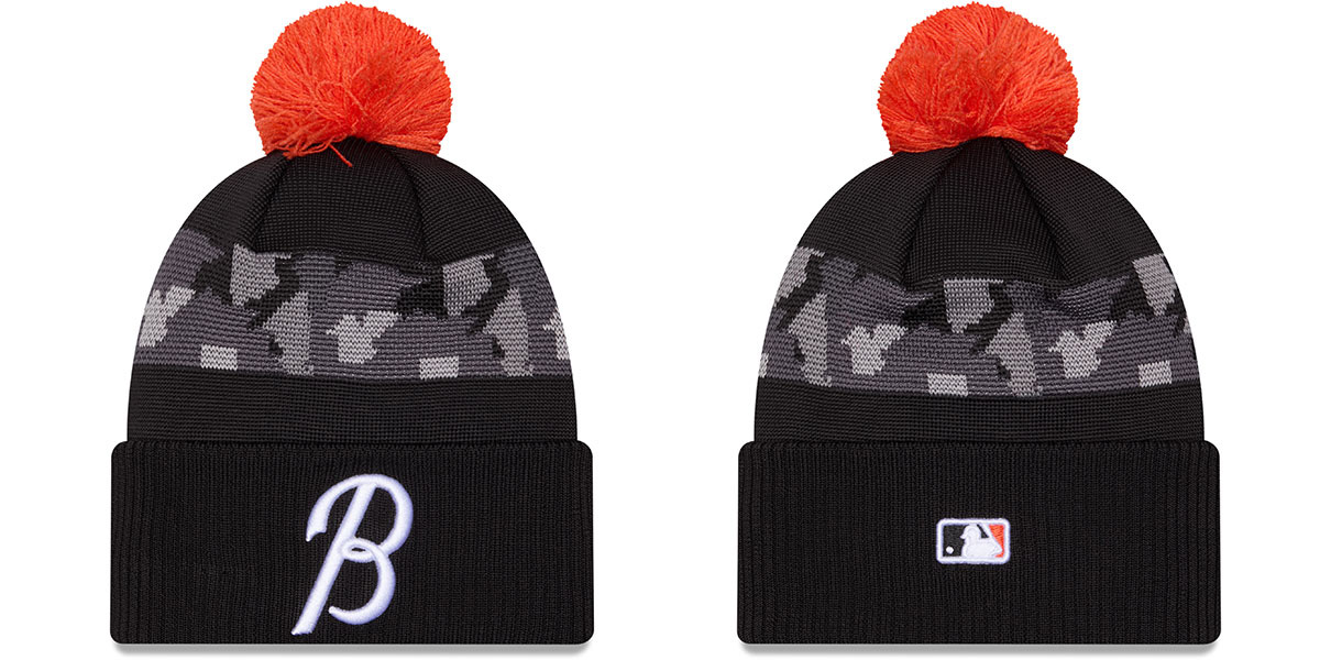 The City Connect knit cap features an acrylic ribbed knit crown and cuff with the City Connect team design. The cuff has a matching raised embroidered City Connect logo, and the top has a matching pom-pom. The side features an embroidered New Era flag, and the back has a matching raised embroidered MLB logo. This Baltimore Orioles hat is made by New Era and is licensed by the MLB - Major League Baseball.