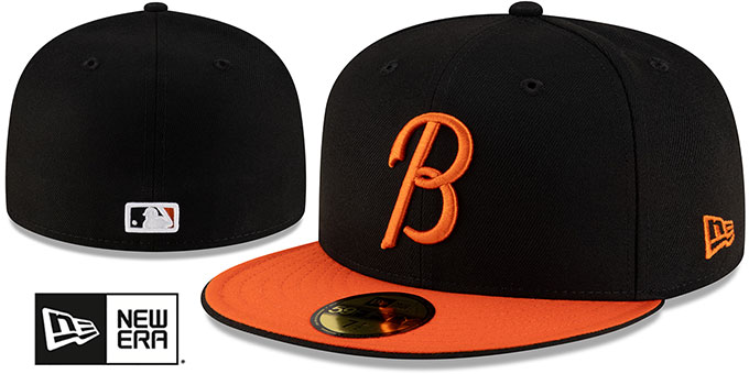 MLB Authentic Collection and ORIGINAL 59FIFTY fitted performance poly hat by New Era, black deep crown and orange visor, black undervisor, raised embroidered Alternate-2 B team logo on front, embroidered New Era logo on side, raised embroidered MLB logo on back, This is the style of Onfield hat worn by all MLB teams during the MLB season. This Baltimore Orioles baseball cap is made by New Era and is licensed by the MLB - Major League Baseball.