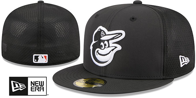 MLB Authentic Collection and ORIGINAL 59FIFTY fitted nylon poly hat by New Era, black nylon crown and visor with black batting practice lightweight performance mesh middle and back panels, black undervisor, raised embroidered team logo on front, embroidered New Era logo on side, raised embroidered MLB logo on back in team colors, This is the style of Onfield Batting Practice hat worn by MLB teams during the 2026 MLB season. This Baltimore Orioles baseball cap is made by New Era and is licensed by the MLB - Major League Baseball.