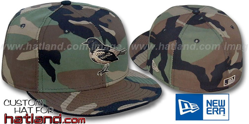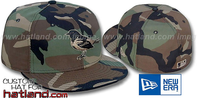 Authentic and Original 59FIFTY fitted hat by New Era, woodland camouflage (black, khaki, brown, green) cotton deep crown and visor, matching raised embroidered team logo on front, black under visor, matching MLB logo on back EACH CAMO HAT PATTERN WILL BE SLIGHTLY DIFFERENT SO NO TWO HATS WILL BE THE SAME. This Baltimore Orioles baseball cap is made by New Era and is licensed by the MLB - Major League Baseball.