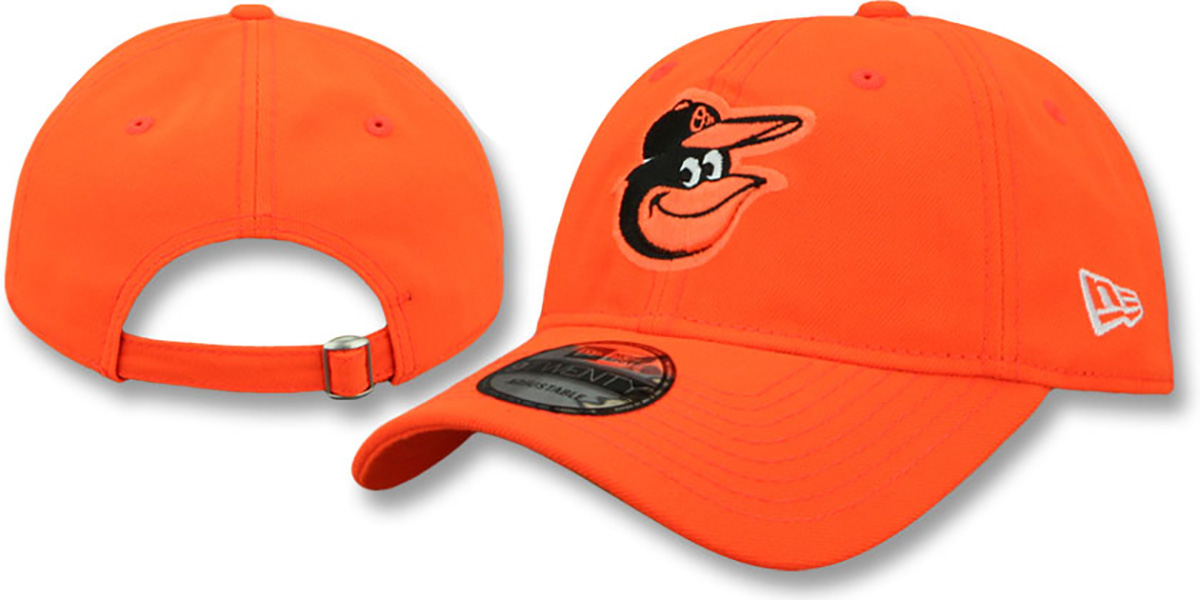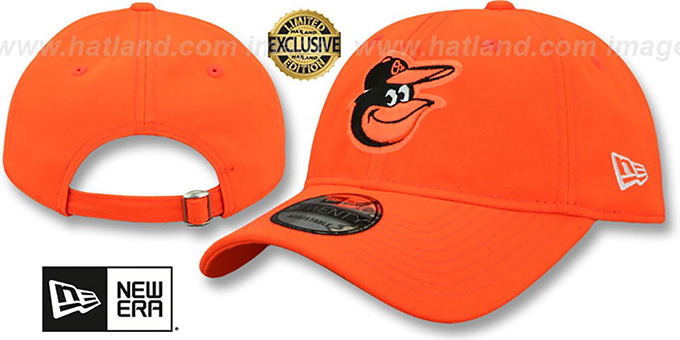Low Crown 9-TWENTY adjustable hat by New Era that has rounded unstructured crown and curved brim, neon (bright) orange cotton crown and visor and undervisor, raised embroidered team logo on front in black and white, New Era flag embroidery on side, matching adjustable Strapback with slide metal loop closure This hat produced EXCLUSIVELY for Hatland.com. This Baltimore Orioles hat is made by New Era and is licensed by the MLB - Major League Baseball.