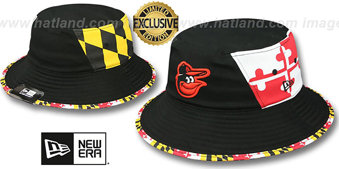 HATLAND.COM Exclusive, Cotton Bucket hat with black crown and brim, side panels with opposite print of Maryland flag on each side, Maryland printed flag design on edging of brim and undervisor, raised embroidered Orioles team logo on front, black headband inside, black adjustable string that can be removed, Approximate Sizes: Small/Medium 7-7 1/4, Medium/Large 7 1/4-7 1/2, Large/XLarge 7 1/2-7 7 3/4. This Baltimore Orioles hat is made by New Era and is licensed by the MLB - Major League Baseball.