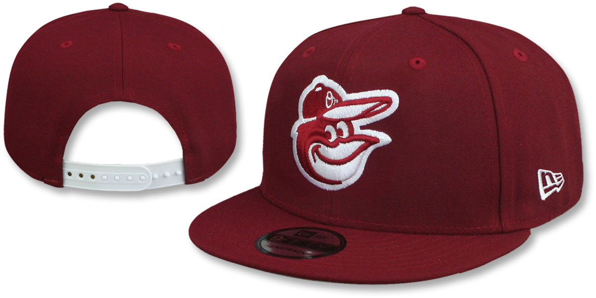Original 9FIFTY adjustable poly hat by New Era that has similar deep crown and flat brim fit as the 59-Fifty, burgundy crown and visor, light grey undervisor, raised embroidered team logo on front in burgundy and white, embroidered New Era logo on side in white, white adjustable Snapback closure. This Baltimore Orioles hat is made by New Era and is licensed by the MLB - Major League Baseball.