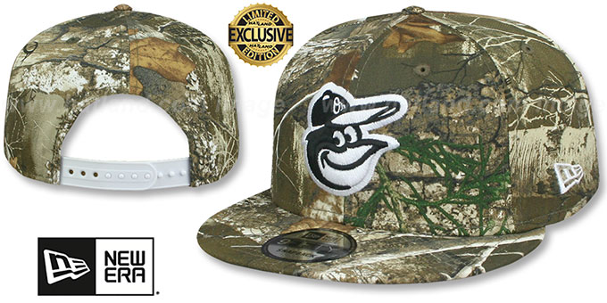 Original 9FIFTY adjustable poly hat by New Era that has similar deep crown and flat brim fit as the 59-Fifty, realtree camouflage (tans, browns, and greens) cotton crown and visor, light grey undervisor, raised embroidered team logo on front in black and white, embroidered New Era logo on side in white, white adjustable Snapback closure, EACH CAMO HAT PATTERN WILL BE SLIGHTLY DIFFERENT SO NO TWO HATS WILL BE THE SAME. This Baltimore Orioles hat is made by New Era and is licensed by the MLB - Major League Baseball.