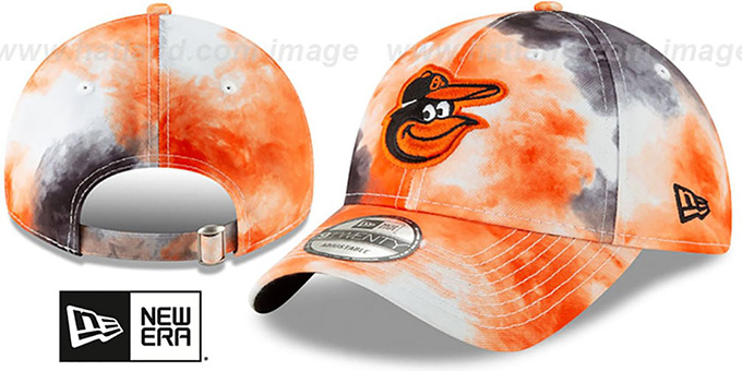 Low Profile 9TWENTY slouch fit cotton hat by New Era, team colors orange-black-white Tie-Dye lightly structured rounded crown and visor, black undervisor, raised embroidered team logo on front in team colors, embroidered New Era flag on side, matching adjustable strapback closure with slide buckle closure. This Baltimore Orioles hat is made by New Era and is licensed by the MLB - Major League Baseball.