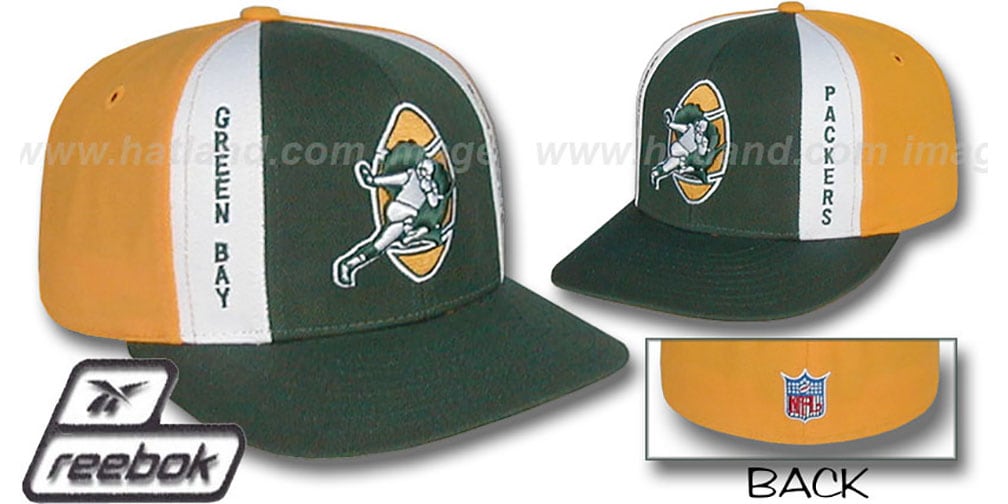 'Authentic' wool fitted hat by Reebok with original cut and flat brim that can be curved if preferred, dark green front panels with white V panels on each side with team name, gold mid and back panels, old school Packers logo embroidery on front and NFL shield logo on back. This Green Bay Packers hat is made by Reebok and is licensed by the NFL National Football League.