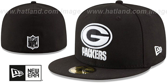Authentic and ORIGINAL 59Fifty fitted hat by New Era, black authentic poly or wool deep crown and visor, grey undervisor, raised embroidered team logo on front in black and white, white embroidered New Era logo on side, matching raised embroidered NFL shield logo on back. This Green Bay Packers hat is made by New Era and is licensed by the NFL National Football League.