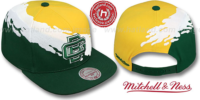 Authentic wool adjustable hat by Mitchell & Ness with original cut and flat brim, gold top of crown, white embroidered Paintbrush stripe across topside of crown, dark green side crown and visor, throwback light grey undervisor, raised embroidered oversized team logo on front, embroidered Mitchell & Ness logo on side back by adjustable plastic Snapback strap. This item is on SALE!. This Green Bay Packers hat is made by Mitchell & Ness and is licensed by the NFL - National Football League.