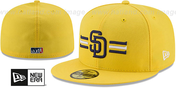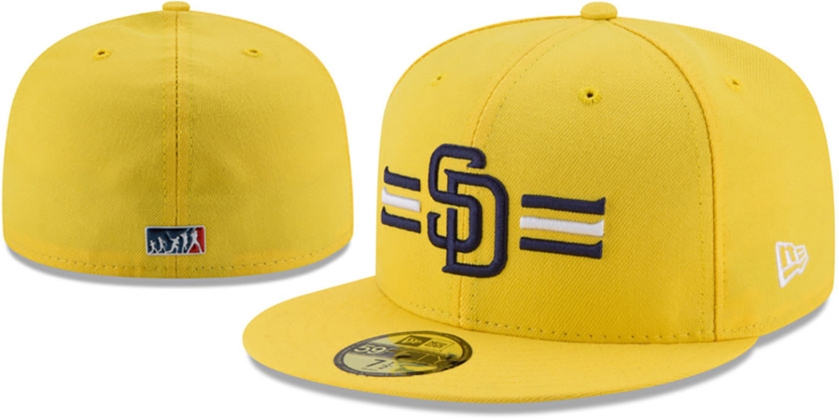 MLB Authentic and ORIGINAL 59FIFTY fitted performance poly hat by New Era, Neon Yellow authentic poly deep crown and visor, light grey undervisor, raised embroidered team logo on front with raised bars, embroidered New Era logo on side, Little League embossed liquid chrome logo on back, This is the fitted hat worn during 2017 Little League MLB games in August 2017 and is a collaboration between MLB and Little League. This San Diego Padres baseball cap is made by New Era and is licensed by the MLB - Major League Baseball.