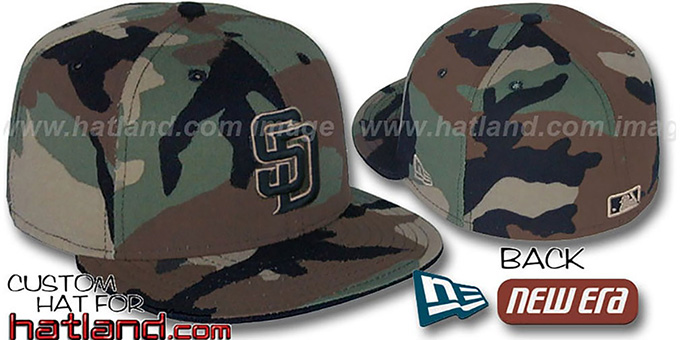 'Authentic' and Original 5950 fitted hat by New Era, woodland camouflage (black, khaki, brown, green) cotton crown and visor, matching raised embroidered team logo on front, black under visor, matching MLB logo on back EACH CAMO HAT PATTERN WILL BE SLIGHTLY DIFFERENT SO NO TWO HATS WILL BE THE SAME. This San Diego Padres hat is made by New Era and is licensed by the MLB - Major League Baseball.