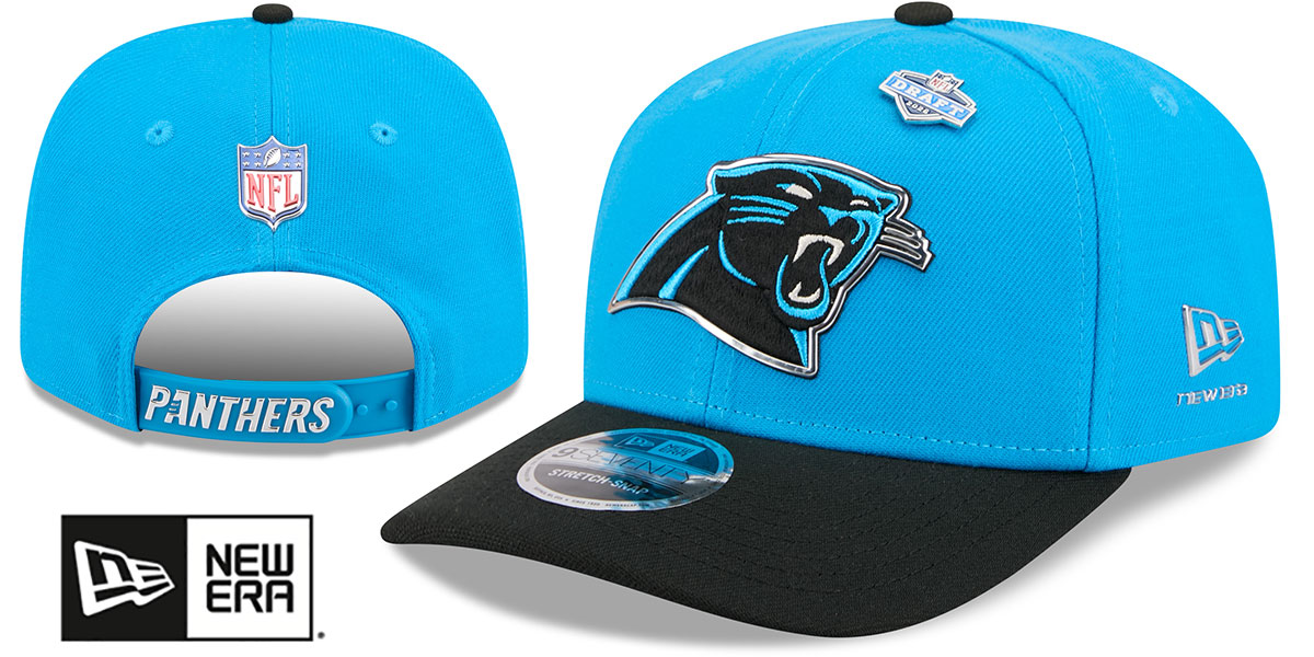 This New Era Low Profile 9SEVENTY STRETCH SNAP hat features a team color blue rounded crown with black slightly precurved visor and 2026 NFL Draft pin on crown, light grey undervisor, team inspired print on inside front panels, embroidered team logo on front with liquid chrome outline, liquid chrome New Era logo on side, liquid chrome NFL shield logo on back above team color snap with team name in liquid chrome, This is the 9SEVENTY stretch snapback style of hat worn by all NFL players during the 2026 NFL Draft. This Carolina Panthers hat is made by New Era and is licensed by the NFL - National Football League.