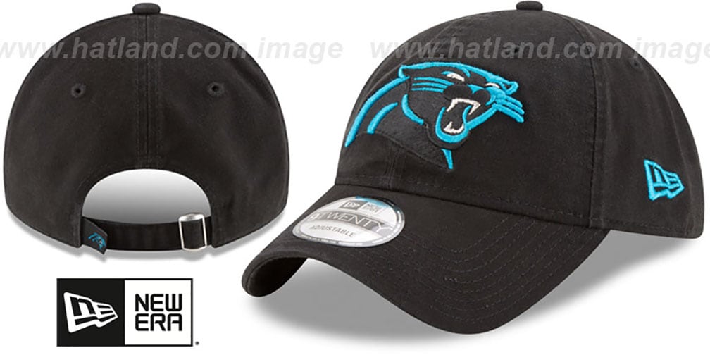 The New Era Low Profile 9TWENTY hat features a slouch fit design crafted from cotton. This black hat has a lightly structured, rounded crown and visor, along with an undervisor. The front showcases a raised, embroidered team logo, while the side displays the New Era flag. An adjustable strap with a slide buckle closure and a team logo hang tag complete the look. This Carolina Panthers hat is made by New Era and is licensed by the NFL - National Football League.