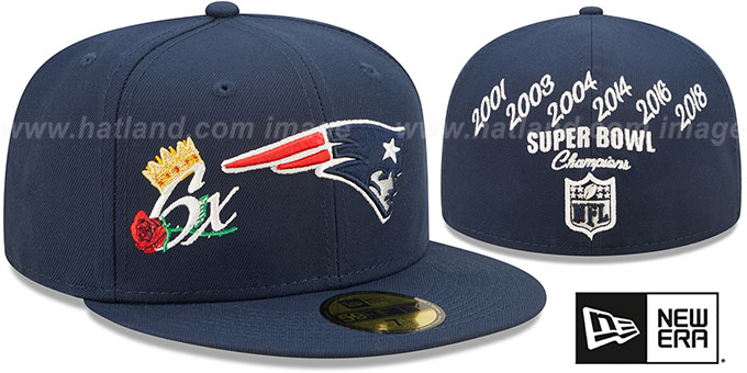 Authentic and Original 59FIFTY fitted hat by New Era, team color navy blue authentic poly crown and visor, light grey undervisor, raised embroidered team logo on front with embroidered 6X with crown and rose, New Era embroidered logo on side, embroidered angled championship years over SUPER BOWL Champions with raised embroidered NFL shield logo. This New England Patriots baseball cap is made by New Era and is licensed by the NFL - National Football League.