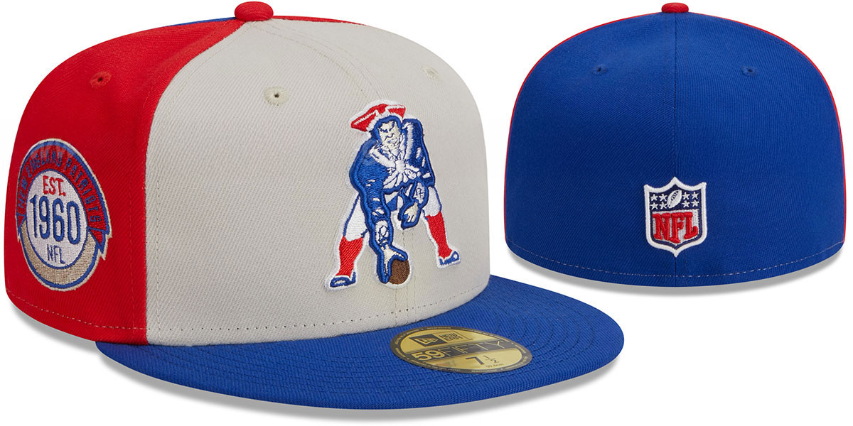 This authentic, original 59Fifty poly fitted hat by New Era features a light tan front, red middle panels, and royal blue back panels and visor. The undervisor is light grey. The front displays a raised, embroidered historic team logo, while the sides feature an embroidered patch with an established date and the New Era flag. The back includes a raised, embroidered NFL shield logo. This New England Patriots hat is made by New Era and is licensed by the NFL - National Football League.
