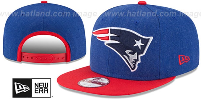 Original fit 9FIFTY adjustable wool blend hat by New Era that has similar deep crown and flat brim fit as the 59-Fifty, heather royal blue crown and red visor, light grey undervisor, raised embroidered Logo Grand oversized team logo on front, embroidered New Era logo on side, arched matching material on back above plastic adjustable Snapback strap. This New England Patriots hat is made by New Era and is licensed by the NFL National Football League.